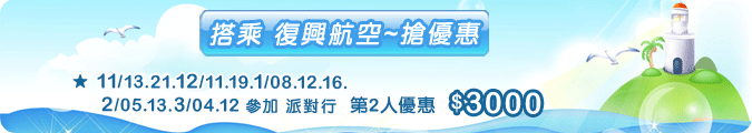 帛琉的早晨是寧靜且誘人的、起個大早讓南太平洋的氣息與您來個不期而遇、如果晨光中的早餐邀約滿足不了您渴望放逐的心情、那麼就讓這份飛揚的情緒前往碼頭即刻搭上豪華快艇,抵達最受女性歡迎的牛奶美容水道,這兒的泥沙呈現著乳白色、除景觀奇特外還有美容養顏的功效喔、愛美的女士可別錯過了這千載難逢的機會!之後來到百年干貝城一覽海底干貝生態奇景,午餐將於幽靜的無人島上享用色香味俱全的 BBQ、香嫩的烤肉配合著現場清蒸魚及美味可口的例湯;還有那沁心冰涼的飲料您可在享用碳烤美食之餘、再次置身於各式熱帶魚群中盡情浮潛或來個陽光沙灘日光浴或是邀約來場浪板獨木舟賽亦是不錯享樂!緊接來到一探世界知名奇景水母湖的神秘,一探成千上萬群無毒的水母有如果凍般的清澈透明若隱若現地環繞在您的四周;這難得的接觸相信將會是您一生中前所未有的神奇體驗!接下來讓我們前往帛琉最具代表的驚奇與七彩的浮潛區,安德魯秘密花園,這是一個號稱浮潛秘密處女地,當快艇靠近時您已經可以感受到安德魯花園的召喚與魔力,反映在海面上的七彩景觀,有著大面積的大型桌面珊瑚、腦狀巨珊瑚、原石珊瑚、朵型珊瑚、七彩藍珊瑚以及那週遭七彩魚群伴隨著,此時您將羨慕這裡的魚群,竟然可以在神仙般地海域自由自在的享樂生活,奇艷珊瑚與七彩魚群感覺她們似乎正在進行著一場選美大賽,您或許不知覺中已成為這場海中盛會競賽的最佳評審。今晚魯賓遜水門星空派對盛會上演時刻;首先星光音樂響起,同時在氣象許可下您可先在一旁觀賞找尋那星空上的北斗七星之星象,緊接著即將上演干貝生態解剖秀,現場將讓您了解到干貝的生態與奧妙,此時您我或許已陶醉在那南太平洋的音樂氣氛中!這時帛琉原住民戰士舞蹈秀將燃起另一波的歡樂氣氛!當然別忘了品嚐一下剛剛現場那鮮美的干貝沙西米西米,還有無限品嚐新鮮美味的生魚片沙西米喔!對了,我們還貼心地提供了( 啤酒+飲料 )歡樂無限暢飲時光讓您搭配新鮮美味的干貝與生魚片。當周遭光線投射海中;隨著那光線聚集來生物亦將上演一場海中生態秀,幸運的話還可看到海底石頭中的螃蟹與海面上漂浮的魷魚顯現出強烈的對比,一個或是躲藏一個或是大方漂浮游動著。就讓這ㄧ切為您帶來一場偷心晚宴…………