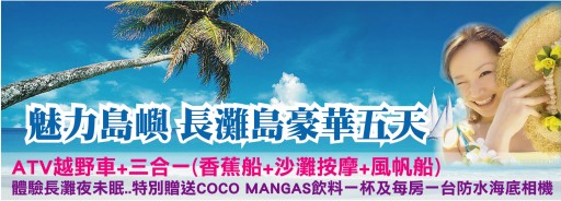 早餐後,安排刺激的【ATV四驅越野車】帶各位前往本島最高點-【TANAWIN】,這是觀賞整個長灘島的最佳地點。不甘寂寞的人可以相約在海邊,帶著小孩堆沙丘城堡、讓孩子們盡情發揮他們的想像力,別忘了帶玩沙器具喔!精力充沛的你更可租部自行車或電單車縱橫全島,到蝙蝠洞、水晶洞尋幽探密一番;也可自費安排各種水上活動,來點刺激的飛魚船、拖曳傘、水上摩托車、獨木舟、沙灘排球或騎馬場享受騎馬快感或高爾夫球場瀟灑揮桿,【本公司贈送水上活動香蕉船、風帆船及沙灘按摩 (三合一)】(未滿12歲小孩,恕不贈送按摩)另外對瞎拼有特別狂熱的人,長灘島絕對可以滿足您需求,說不定有您意想不到收獲,但記著一定要削價呢!也可自己安排日光浴,享用一杯冰涼可口的飲料相信定能另您放鬆心情舒筋活骨一番。傍晚時分是長灘島街道沸騰時光,從1號碼頭到3號碼頭之間,真可以說是夜夜笙歌,各家飯店酒館無不使盡絕招好吸引客人上門。比室內,各各燈光好氣氛佳;比戶外,更是燭光晚餐不稀奇,現場表演天天有,讓你捨不得只在一家坐太久。也可至COCO Mangas 免費享用一杯飲料,喝著飲料,欣賞著南國亮麗沙灘美景,交換一天的心情休閒渡假情調隨著喧嘩熱門音樂響起,氣氛非常。餐後自由逛街、購物,建議您:如您有年輕人的衝勁,不如來個時尚流行(女生編個黑人頭,男生綁個刺蝟頭,秀出青春活力。《備註:沙灘按摩小費Peso 100請當地付》